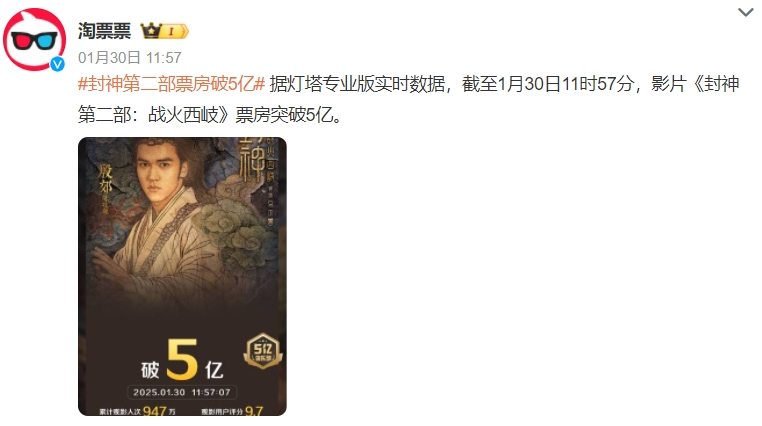 另一大热门电影《封神2》由北京文化(000802.SZ)主投主控,是近两年北京文化的大投资体量的重点项目。目前《封神2》豆瓣评分滑落至6.3,票房成绩位列第三。