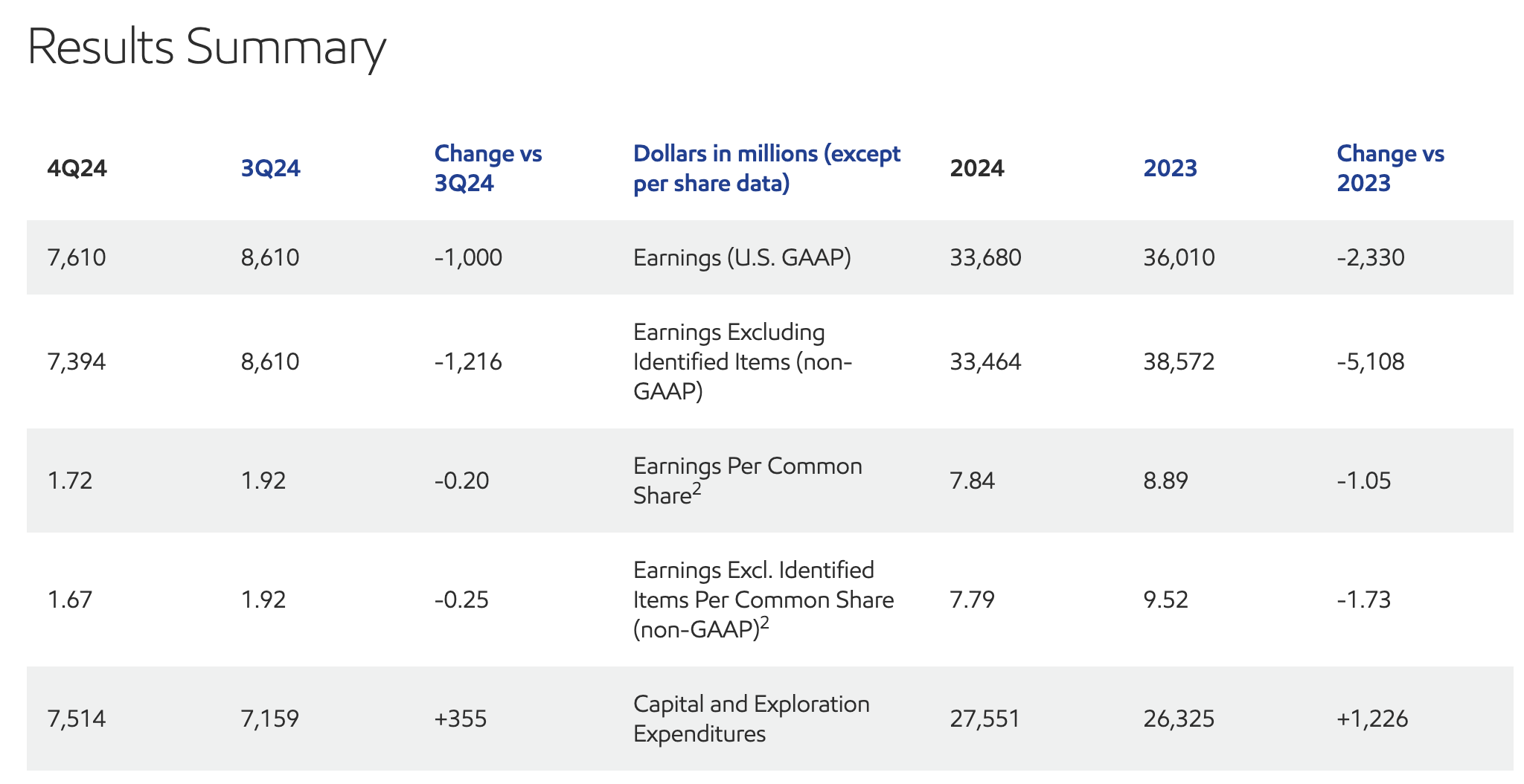 1月31日,埃克森美孚公司宣布,2024年第四季度收益为76亿美元,上年同期为86亿美元;经营活动产生的现金流为122亿美元,自由现金流为80亿美元。第四季度资本和勘探支出以及现金资本支出均为75亿美元,使全年支出分别达到276亿美元和256亿美元,均符合全年预期。此外,该公司2024年全年收益为337亿美元,上年同期为360亿美元。