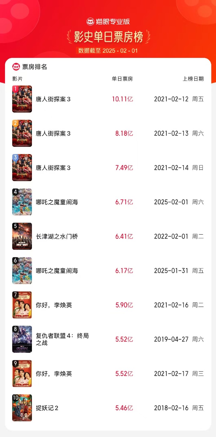 电影《哪吒之魔童闹海》进入中国影史单片单日票房榜前四