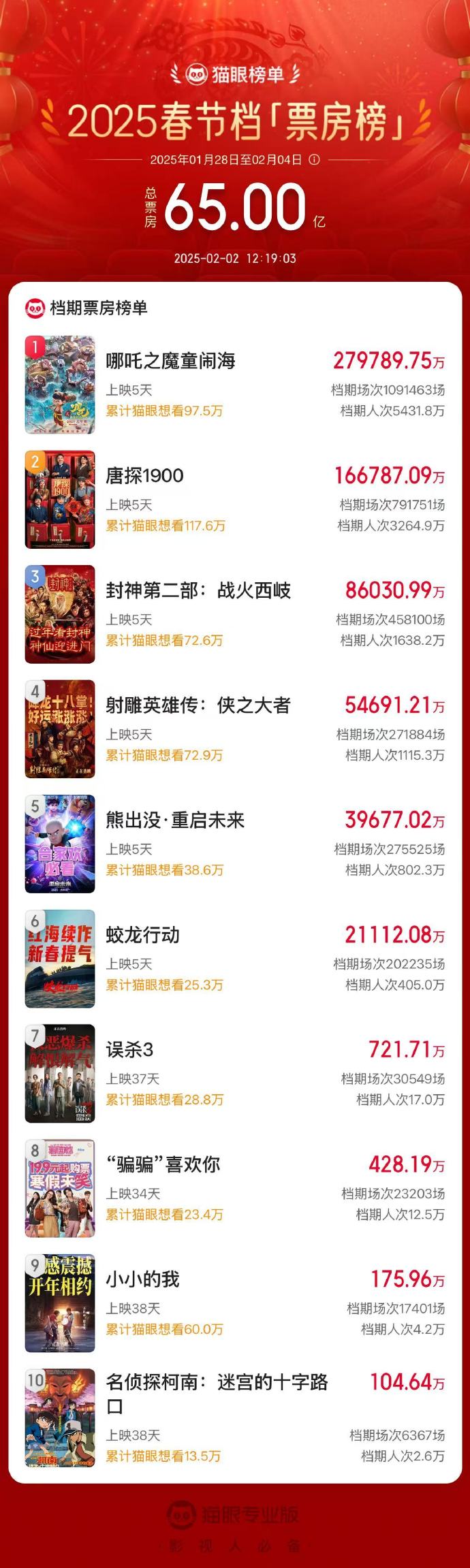 据猫眼专业版数据,2月2日12时19分,2025春节档总票房(含预售)破65亿。《哪吒之魔童闹海》《唐探1900》《封神第二部:战火西岐》分列春节档票房榜前三位。
