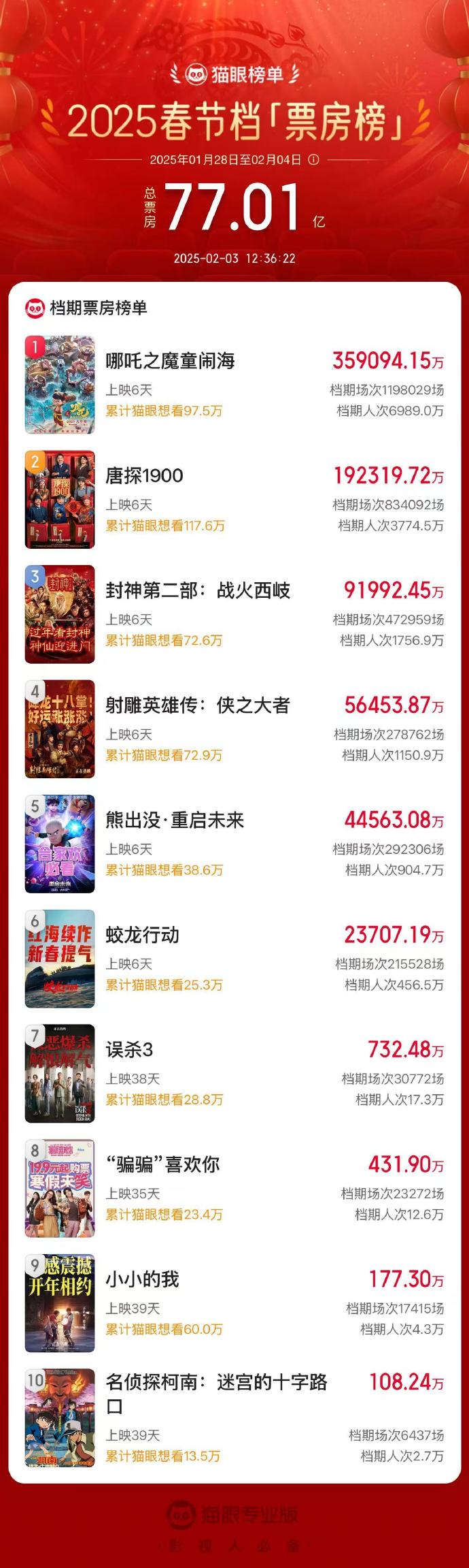 据猫眼专业版数据,2月3日12时36分,2025春节档总票房(含预售)破77亿。《哪吒之魔童闹海》《唐探1900》《封神第二部:战火西岐》分列春节档票房榜前三位。