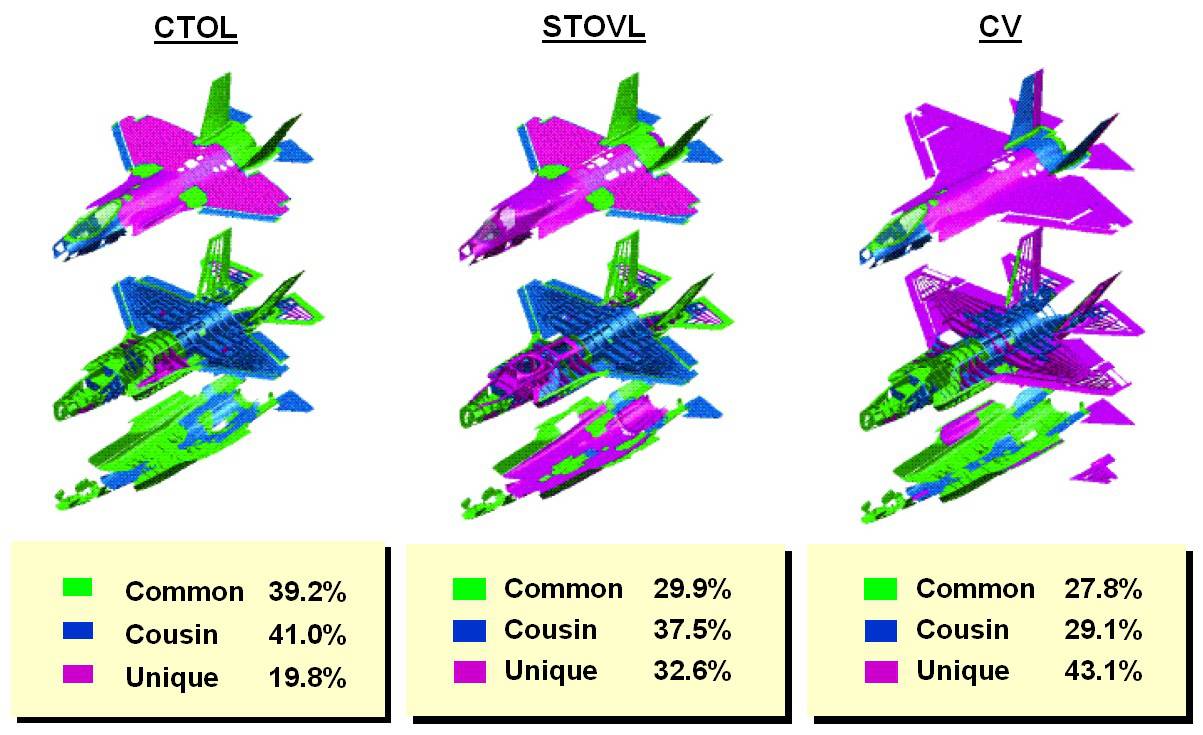 ▲F-35三型通用对比。绿色为三型直接通用,蓝色为型号间设计类似,紫色为该型独有。