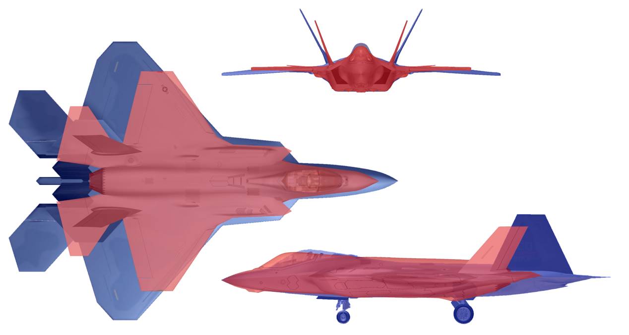 然而这两条“妥协”都站不稳脚跟。首先美国海军陆战队之所以坚持需要拥有能短距离垂直起降的战机,是因为作为先遣部队,海军陆战队常常要在前线机场尚未建设完毕或遭到破坏下执行任务,航程比直升机远,且具备空战能力的短距离垂直起降固定翼飞机自然尤为重要。其次,F-35的机体并不宽,觉得宽其实是视觉效果,在和其他战机的直接对比图上便一目了然。