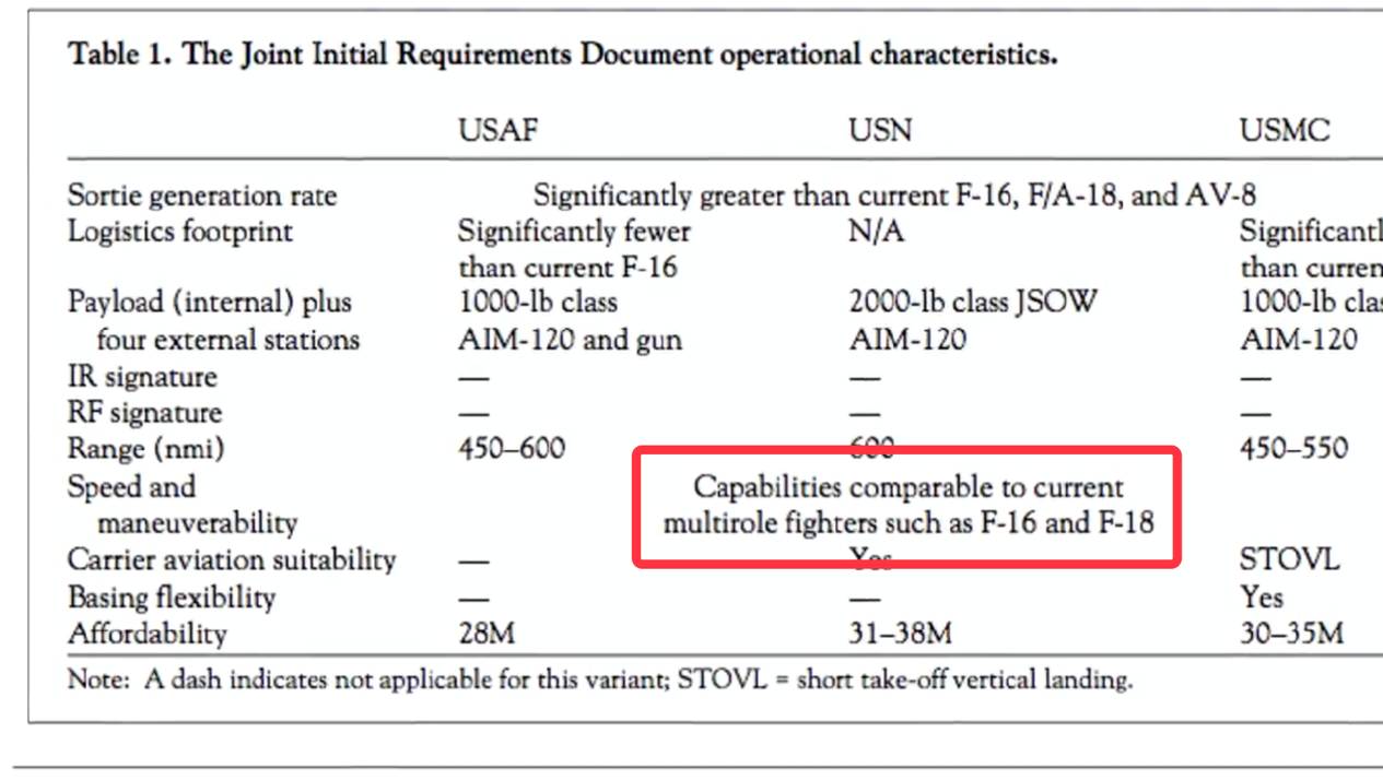 除去F-35设计上两条“妥协”的流言外,关于F-35性能的最大流言便是因考虑到超视距空战将会是外来主流,F-35侧重航电而放弃了机动能力。这一点不得不说是很多军迷的酸葡萄心理,穷人的孩子早当家不意味着富人的孩子就要晚当家。JSF项目在招标时便已公布最基础的机动要求,规定必须具备F-16的加速能力和F-18的大迎角飞行能力,而F-16和F-18又恰好是F-35的重点替代对象。也就是说如果F-35任何一型机动要求不达标的话,美国三军是根本不会去买的。