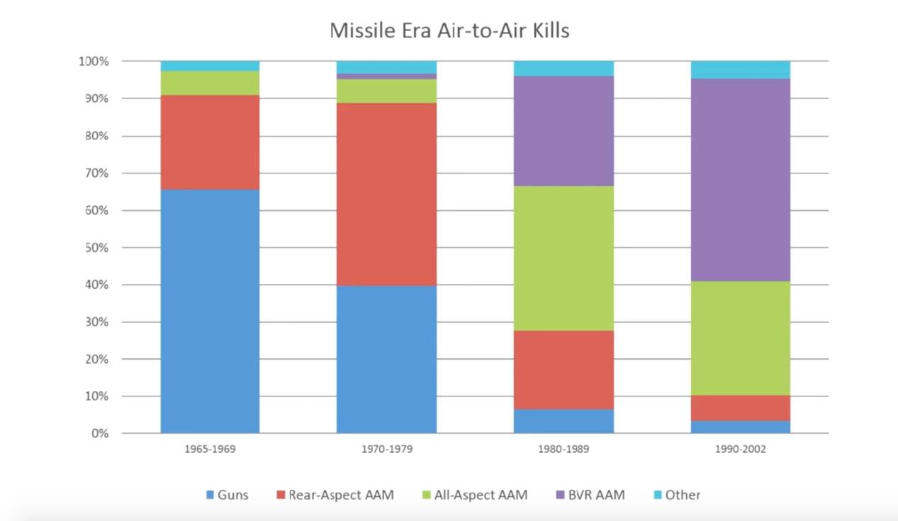 尽管近距离空中格斗在现代空战中依然有可能发生,但统计上来讲已越来越稀少。以美国智库战略与预算评估中心(CSBA)收集到的数据为例,以机炮为主的空战在1965年占据绝对主流,但随着红外制导技术的成熟从1970年开始导弹便已和机炮平分天下,不过此时的红外制导依然需要锁定战机尾焰,本质上依然是近距离格斗用武器。而到1980年随着雷达制导的完善和主动雷达制导导弹的诞生,战机不再需要在交汇后开始攻击。同时新式红外成像技术也让红外制导不再需要锁定战机高温尾焰,这意味着红外制导导弹可在交汇前锁定敌机正面攻击,不再需要进入目视格斗范围。随着21世纪的到来,信息化指挥制导技术对导弹的可靠性和精度有了革命性的提升,以至于近距离格斗击落的战机甚至还没有其他方式击落的多。(注:其他方式包括通过机动使敌机坠机,或被击伤敌机返航途中坠毁等)