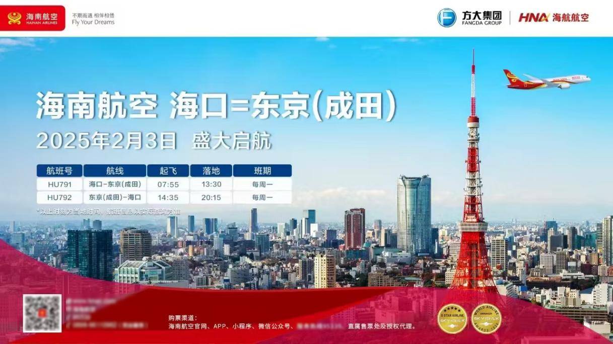 据悉,海南航空海口—东京(成田)国际航线计划每周执行一个往返航班,班期为每周一。去程航班计划北京时间07:55从海口起飞,预计当地时间13:30抵达东京,飞行时长约4小时35分钟;返程航班计划当地时间14:35从东京起飞,北京时间20:15抵达海口,飞行时长约6小时40分钟。以上航班信息以官网最终查询为准。旅客可通过海南航空官网及APP、微信公众号及小程序、服务热线95339、各直属售票处及授权代理购买机票。此外,海南航空还为旅客提供至优座选、预付费行李、机上升舱、商务套票等多元化的产品选择,以满足不同旅客的出行需求。
