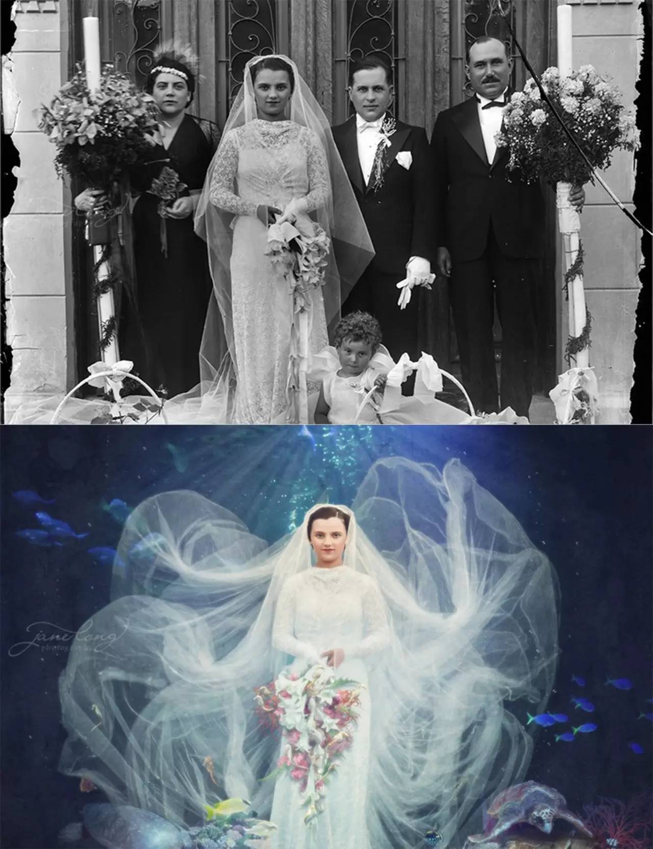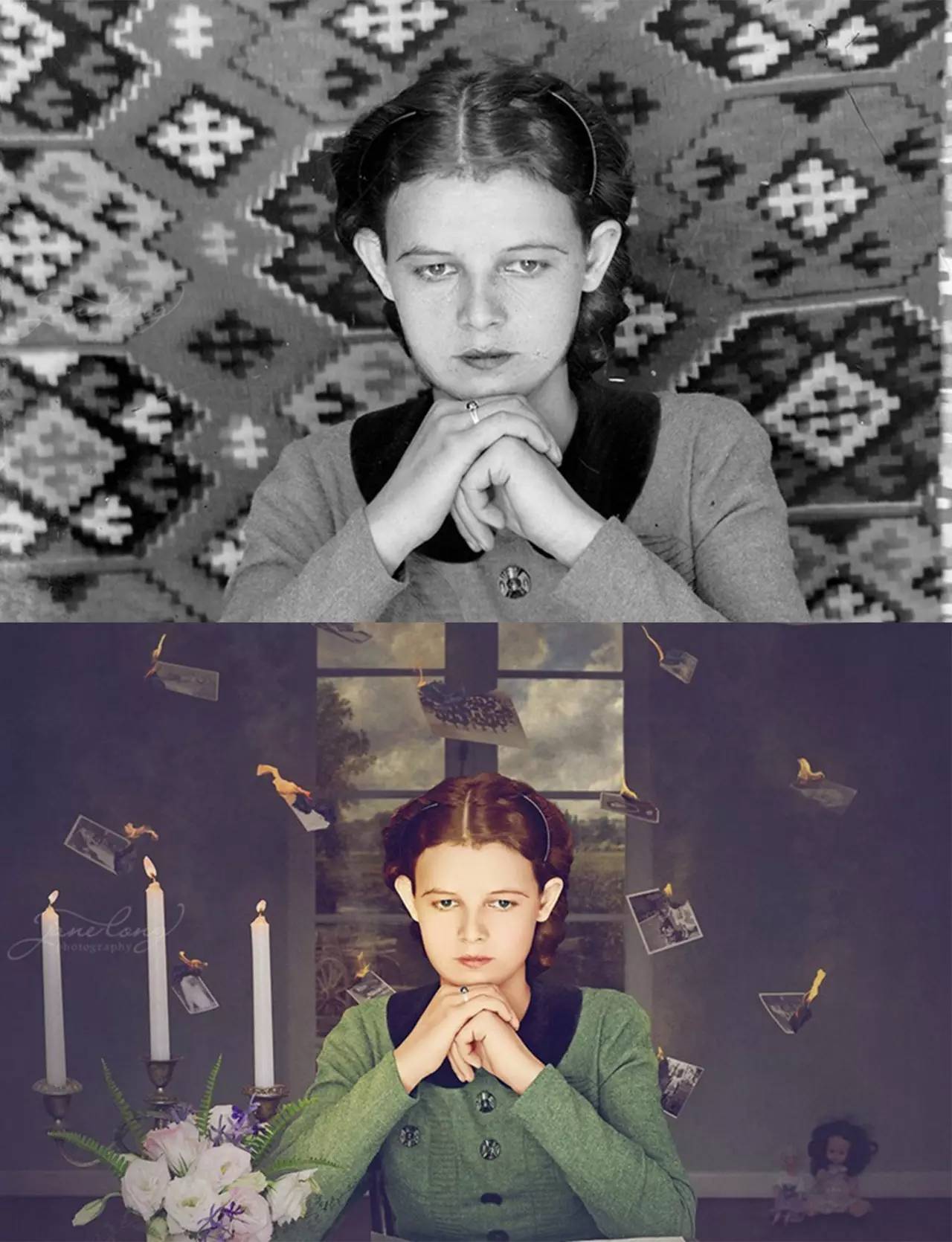 她将已褪色或破碎的老照片通过数码处理的方式,转换成各种奇幻的场景。