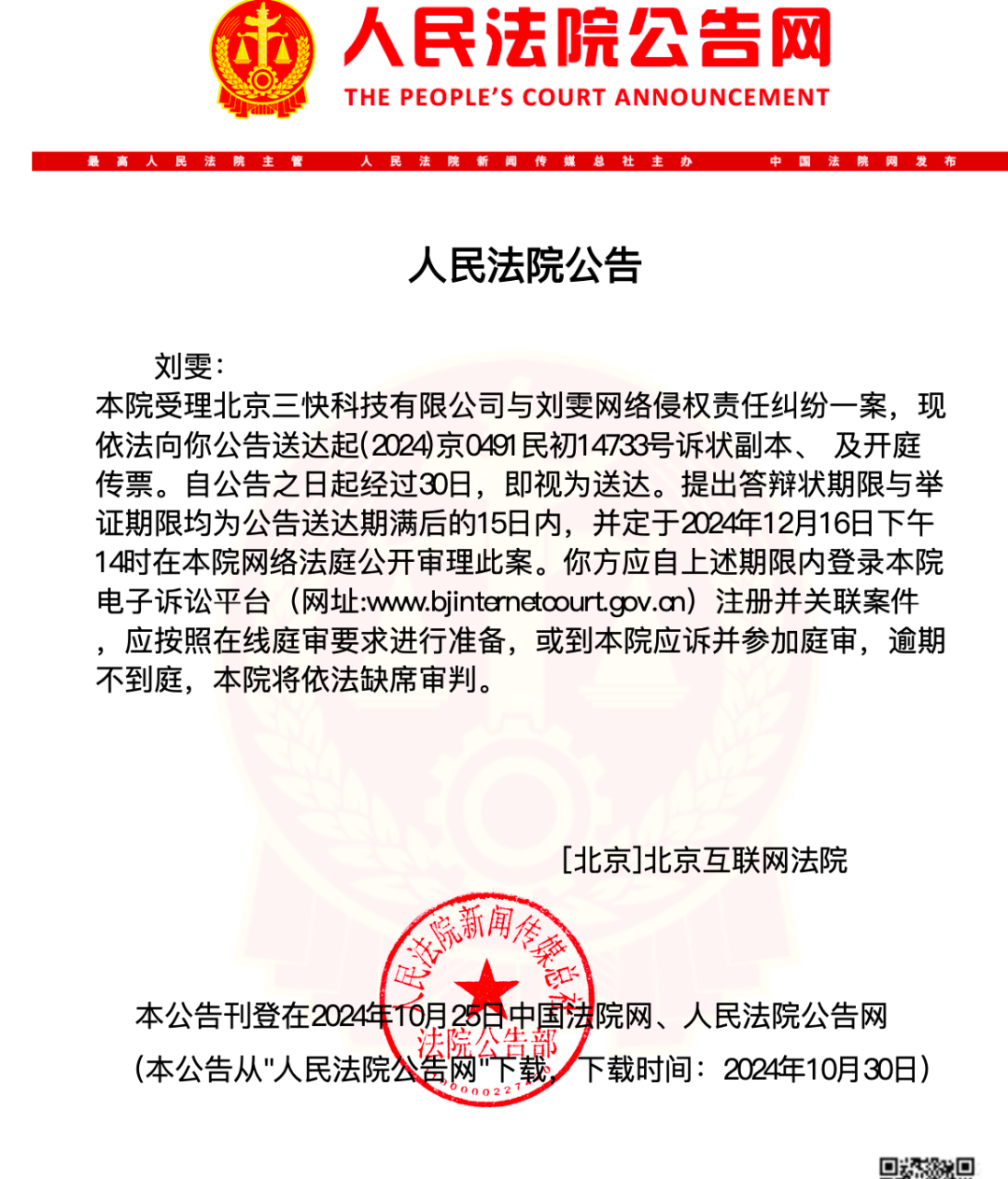法院多次通过手机短信、身份证地址等多种途径,向刘雯送达传票,均未收到回应。因此,法院最终选择“公告送达”方式,在人民法院公告网公示了开庭信息。