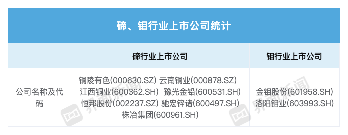 涉及碲金属的上市公司有铜陵有色(000630.SZ) 、云南铜业(000878.SZ)、江西铜业(600362.SH)、豫光金铅(600531.SH) 恒邦股份(002237.SZ) 、驰宏锌诸(600497.SH)、 株冶集团(600961.SH)等。