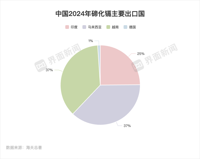 界面新闻查询海关总署数据显示,2024年中国对外出口碲化镉约1223.36吨,同比增长1.87%。
