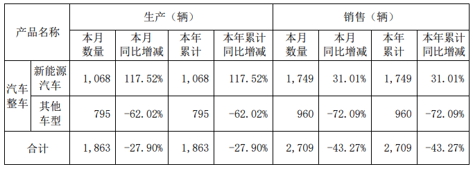力帆科技2月6日公告,2025年1月汽车整车销量合计2709辆,同比下降43.27%。其中,新能源汽车销量1749辆,同比增长31.01%;其他车型销量960辆,同比下降72.09%。