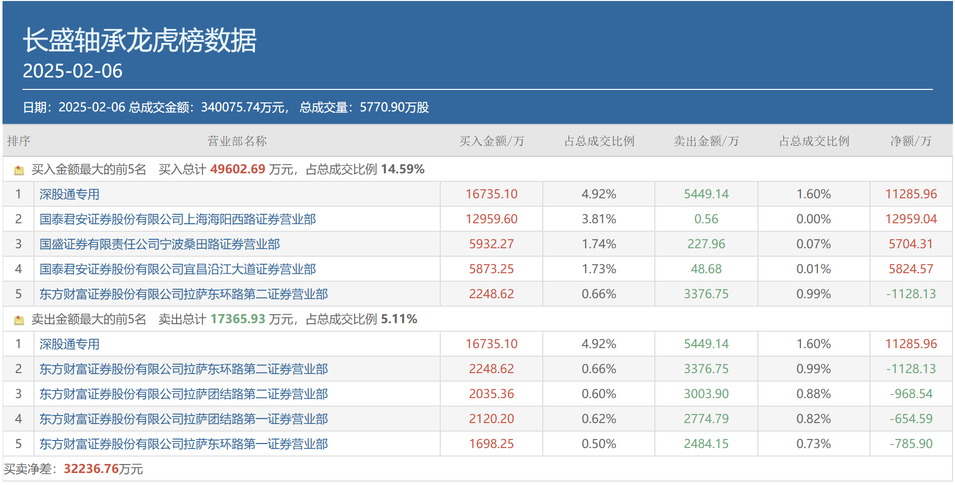 除了比亚迪以外,2月6日章盟主还和宁波桑田路“同框”出现在机器人概念股长盛轴承(300718.SZ)买方前五位中,二者的常用席位国泰君安证券上海海阳西路和国盛证券宁波桑田路分列该股买方第二和第三位,买入金额分别为1.3亿元和5932.27万元。此外,一线游资消闲派的常用席位国泰君安证券宜昌沿江大道也买入该股5873.25万元,居于买方第四位。