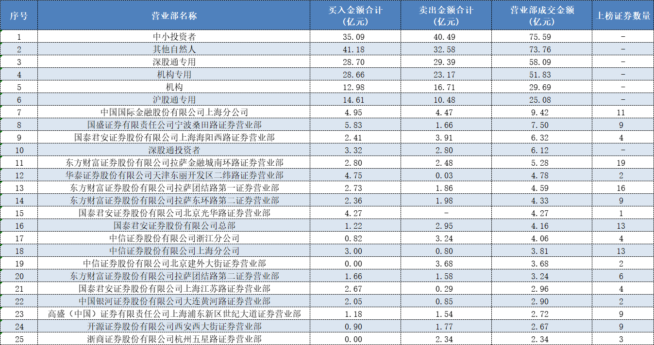 Wind数据显示,当日共有25个营业部的龙虎榜成交金额超过2亿元。其中,宁波桑田路的常用席位国盛证券宁波桑田路成交金额高达7.5亿元;章盟主的常用席位国泰君安证券上海海阳西路和国泰君安证券上海江苏路成交金额分别为6.32亿元和2.96亿元;另有华泰证券天津东丽开发区二纬路、国泰君安证券北京光华路等多个知名游资常用席位也都榜上有名。