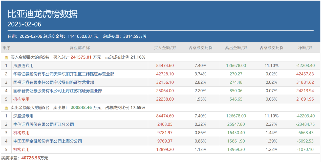 盘后披露的龙虎榜数据显示,知名游资交易猿的常用席位华泰证券天津东丽开发区二纬路位列比亚迪买方第二位,买入金额为4.27亿元;宁波桑田路的常用席位国盛证券宁波桑田路位列买方第三位,买入金额为3.22亿元;章盟主的常用席位国泰君安证券上海江苏路则以2.51亿元的买入额居于该股买方第四位。