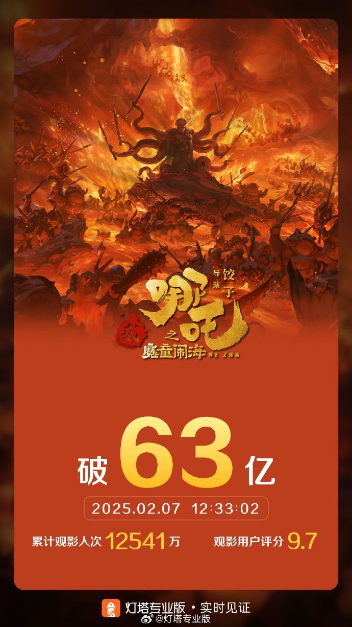 据灯塔专业版实时数据,截至2月7日12时33分,影片《哪吒之魔童闹海》票房突破63亿。