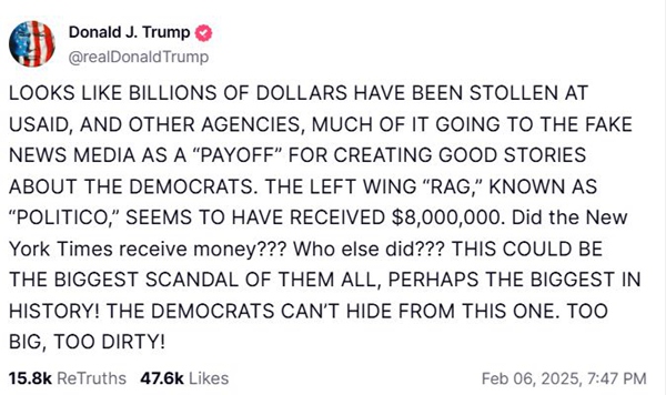 周四,特朗普继续在社交媒体发文,指责国际开发署和其他机构花800万美元收买左翼媒体“政治新闻网”,让媒体为民主党人说好话。他质问:“《纽约时报》是不是也收了钱?其他还有谁?”