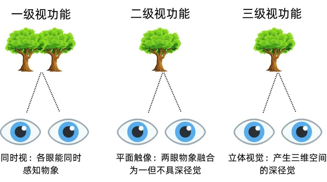 双眼视功能包括同时视、融合视、立体视,三级功能协同合作,才能清晰、舒服、持久地看东西。如果三者不能同时正常作用,则有可能是双眼视功能异常,需要进行视功能训练。