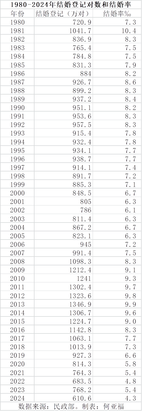 民政部最新数据显示,2024年全国结婚登记对数仅为610.6万对,较2023年减少157.4万对,降幅达20.5%,创下自1980年以来的最低纪录。在经过疫情后的小幅反弹后,中国结婚对数再次回归下降的长期趋势,揭示出人口结构、经济压力、婚姻观念的深刻变化。
