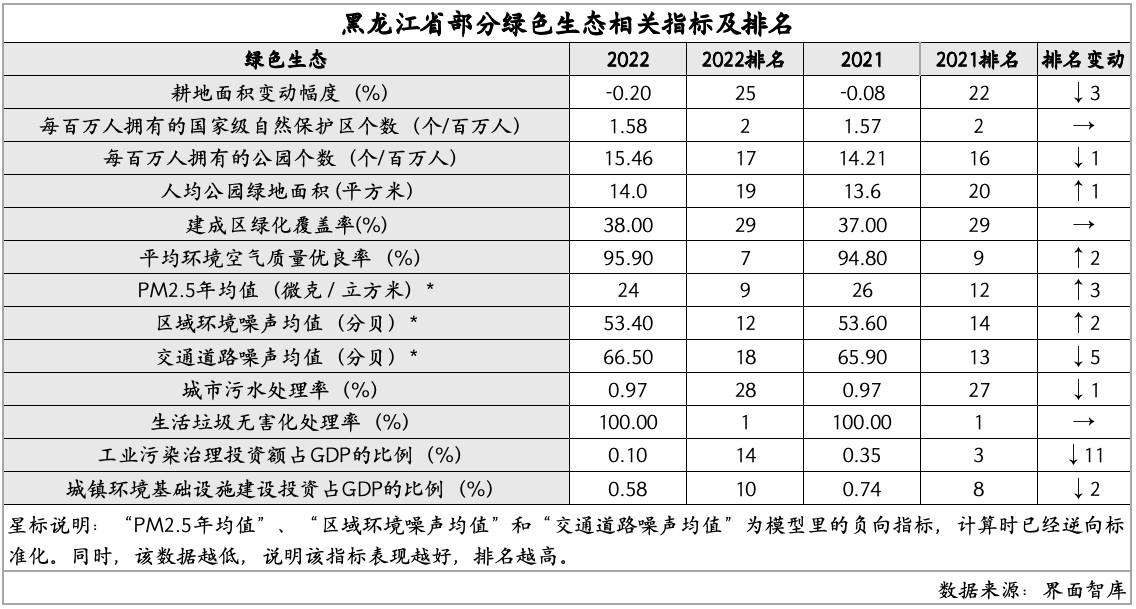 界面智库构建的一级指标“绿色发展”中涵盖了4个二级指标和16个三级指标。在二级指标方面,涵盖的范围包括绿色产业、绿色能源、绿色交通和资源利用,黑龙江在绿色能源方面表现尚可,但在绿色产业、绿色交通和资源利用上明显滞后,传统产业转型困难、高能耗问题依旧突出,导致整体绿色发展步伐缓慢。