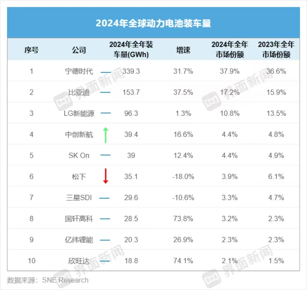 在去年全球动力电池装车量前十榜单中,只有两家企业的排名发生了变动,中创新航(03931.HK)排名从上年的第六上升两位至第四,松下则从原来的第四下降两位至第六。