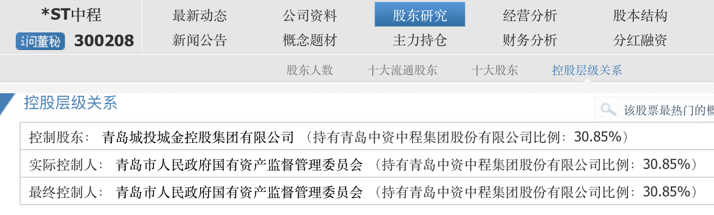 资料显示,青岛城投城金控股集团有限公司为*ST中程的控股股东,同时上述3家公司又是*ST中程间接控股股东青岛城市建设投资(集团)有限责任公司的全资子公司。*ST中程最终的实际控制人是青岛国资委。