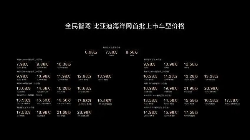 2月10日晚上,在比亚迪智能化战略发布会上,比亚迪董事长王传福重磅宣布,天神之眼高阶智驾系统,比亚迪旗下10万元级以上车型全系搭载,10万元以下车型多数搭载,加配不加价。其中天神之眼 C首批上市21款车型,覆盖7万级到20万级,智驾版海鸥的售价已下探到6.98万元。