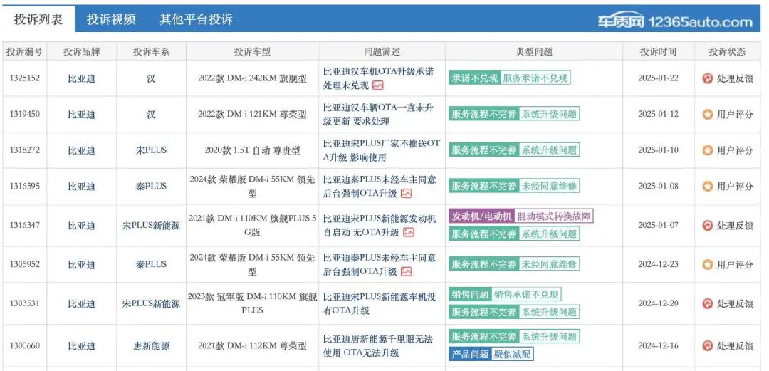 在车质网上,关于比亚迪“车机升级承诺未兑现”、“强制OTA升级”等投诉出现在列表中。