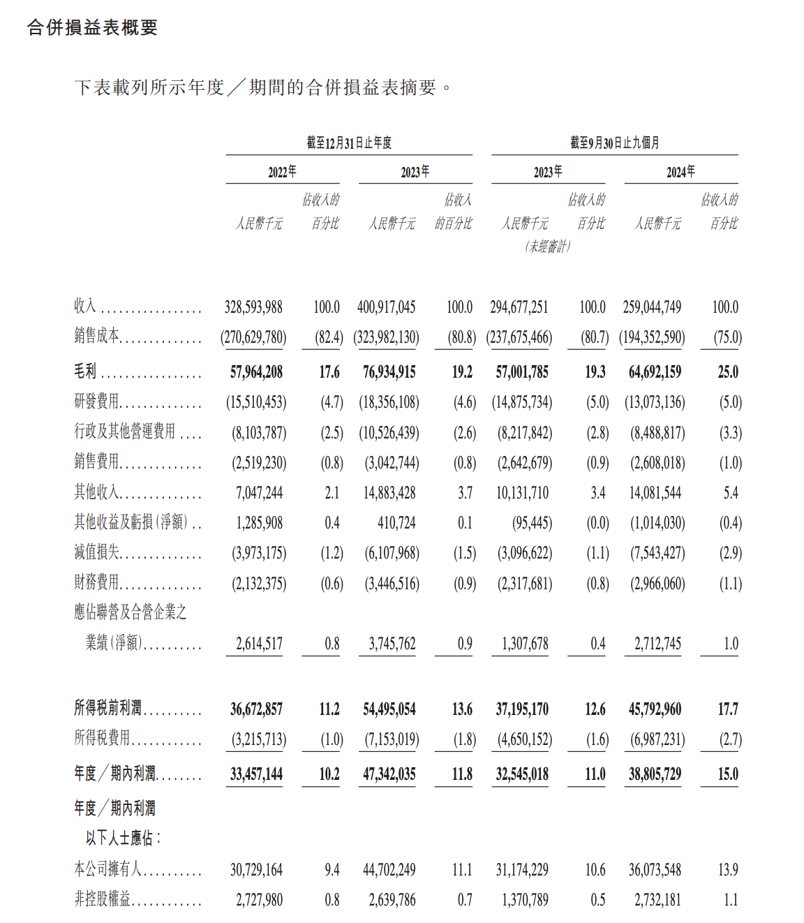 根据招股书披露的数据,宁德时代在过去几年中实现了营收和利润的显著增长。2022年,公司实现营业收入人民币3,286亿元,2023年进一步增长至人民币4,009亿元。截至2024年9月30日止的9个月,公司营业收入达到人民币2,590亿元。