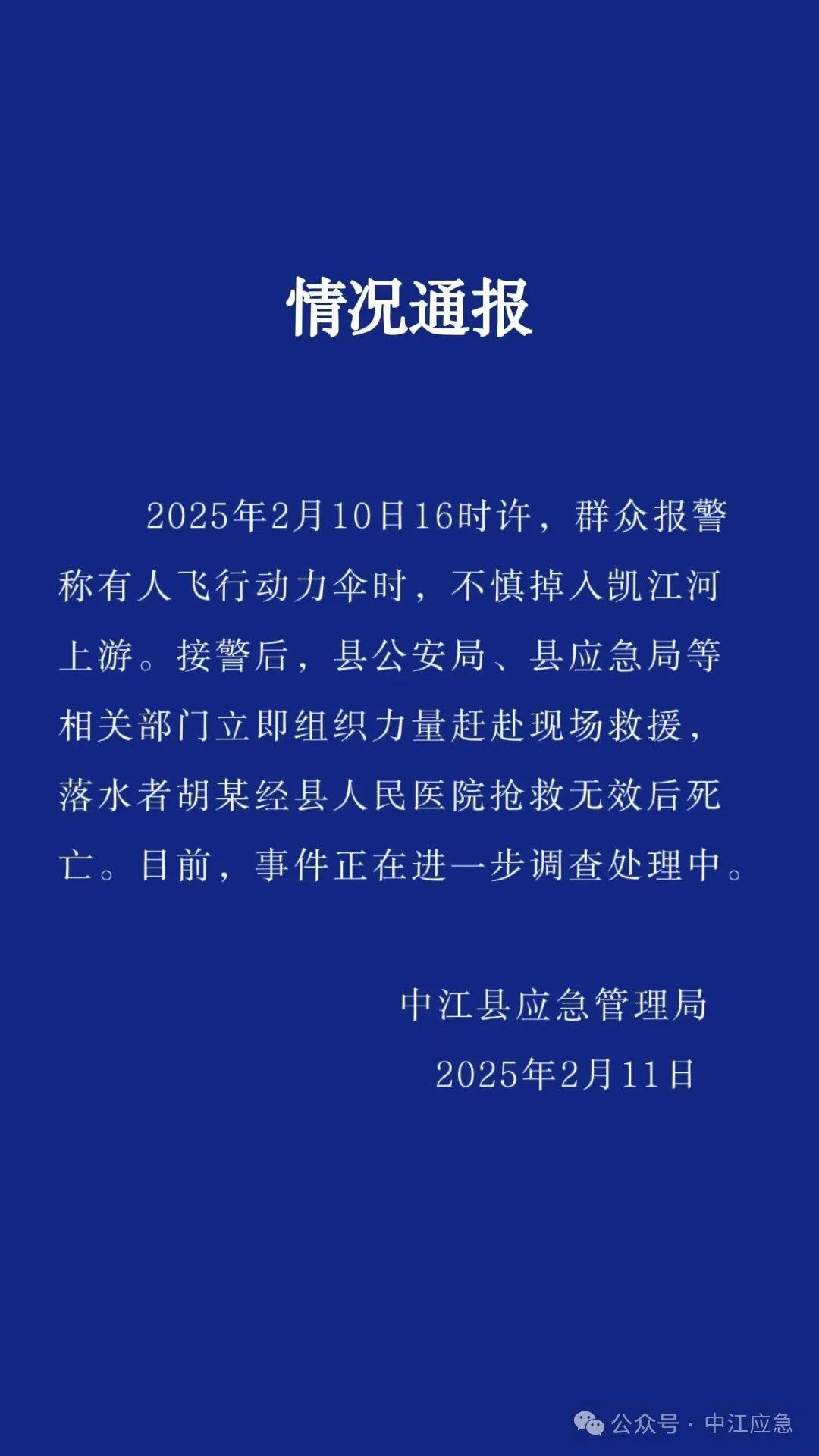 2月11日,四川德阳市中江县应急管理局发布情况通报,2月10日16时许,群众报警称有人飞行动力伞时,不慎掉入凯江河上游。接警后,中江县公安局、应急局等相关部门立即组织力量赶赴现场救援,落水者胡某经县人民医院抢救无效后死亡。目前,事件正在进一步调查处理中。