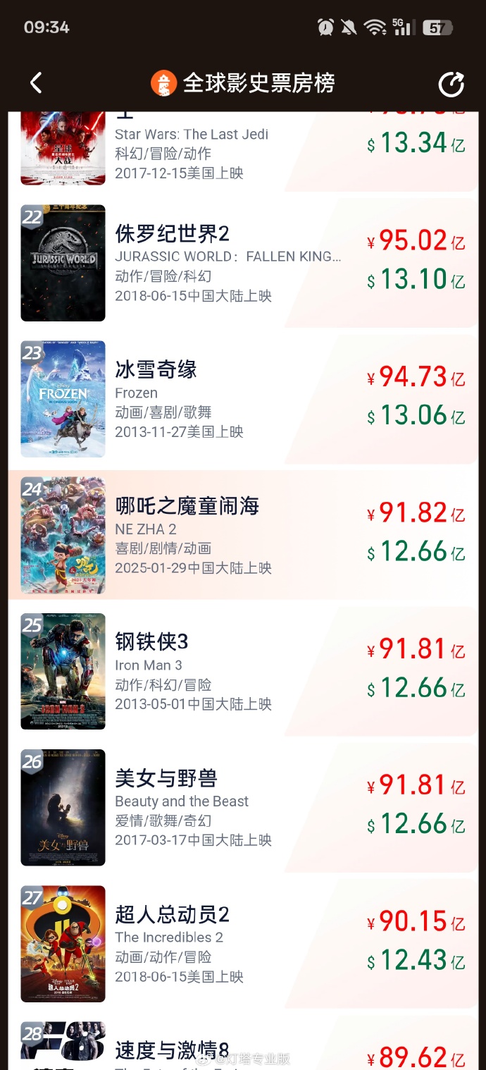 据灯塔专业版全球票房榜显示,截至2月12日,影片《哪吒之魔童闹海》总票房(含预售)突破12.66亿美元, 超过《钢铁侠3》《美女与野兽》,进入全球影史票房榜前24名,即将超越《冰雪奇缘》。