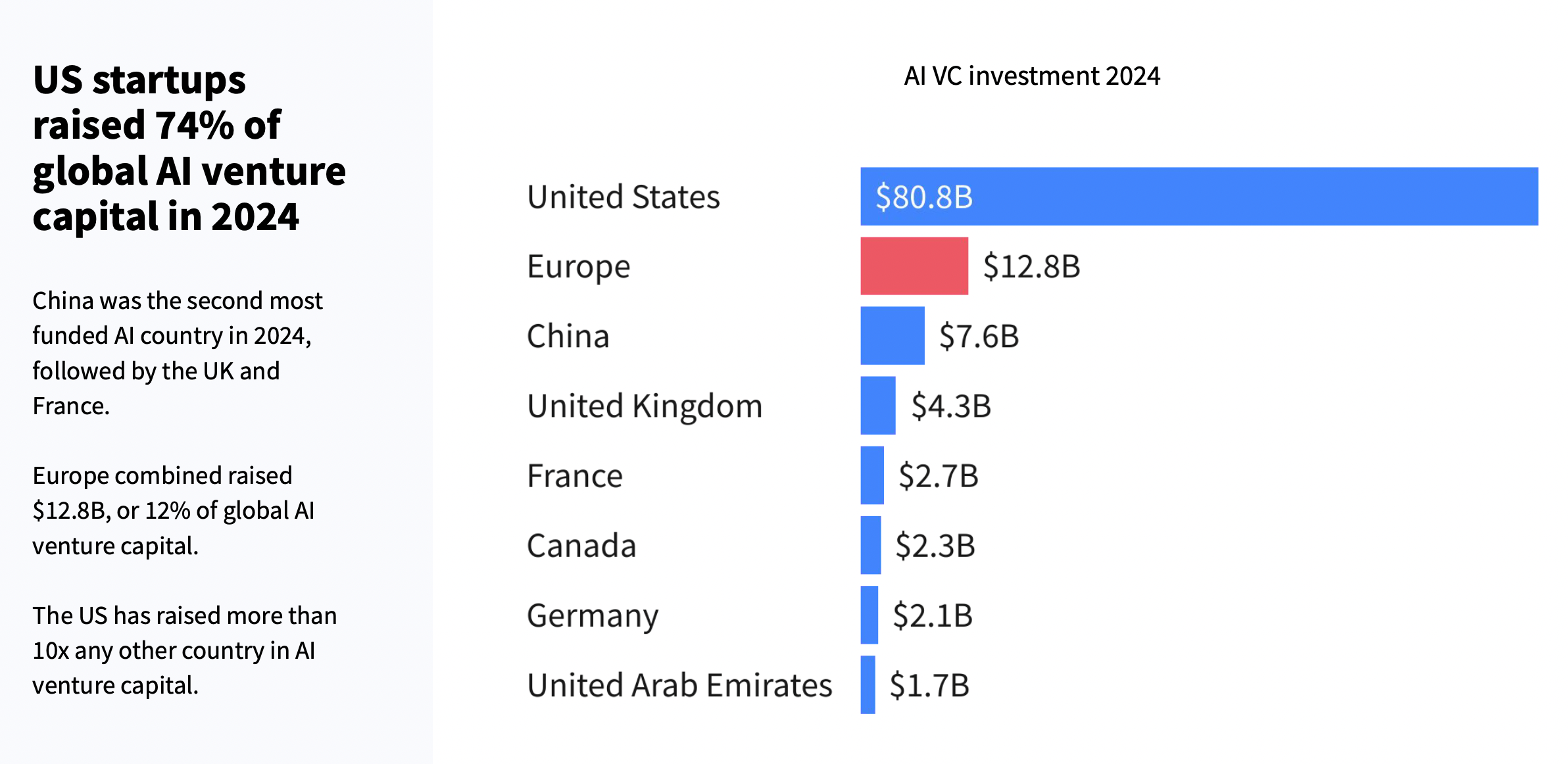 中国在2024年的AI投资表现格外亮眼,投资额达76亿美元,按单一国家算位列第二位,仅次于美国,其后是英国和法国。