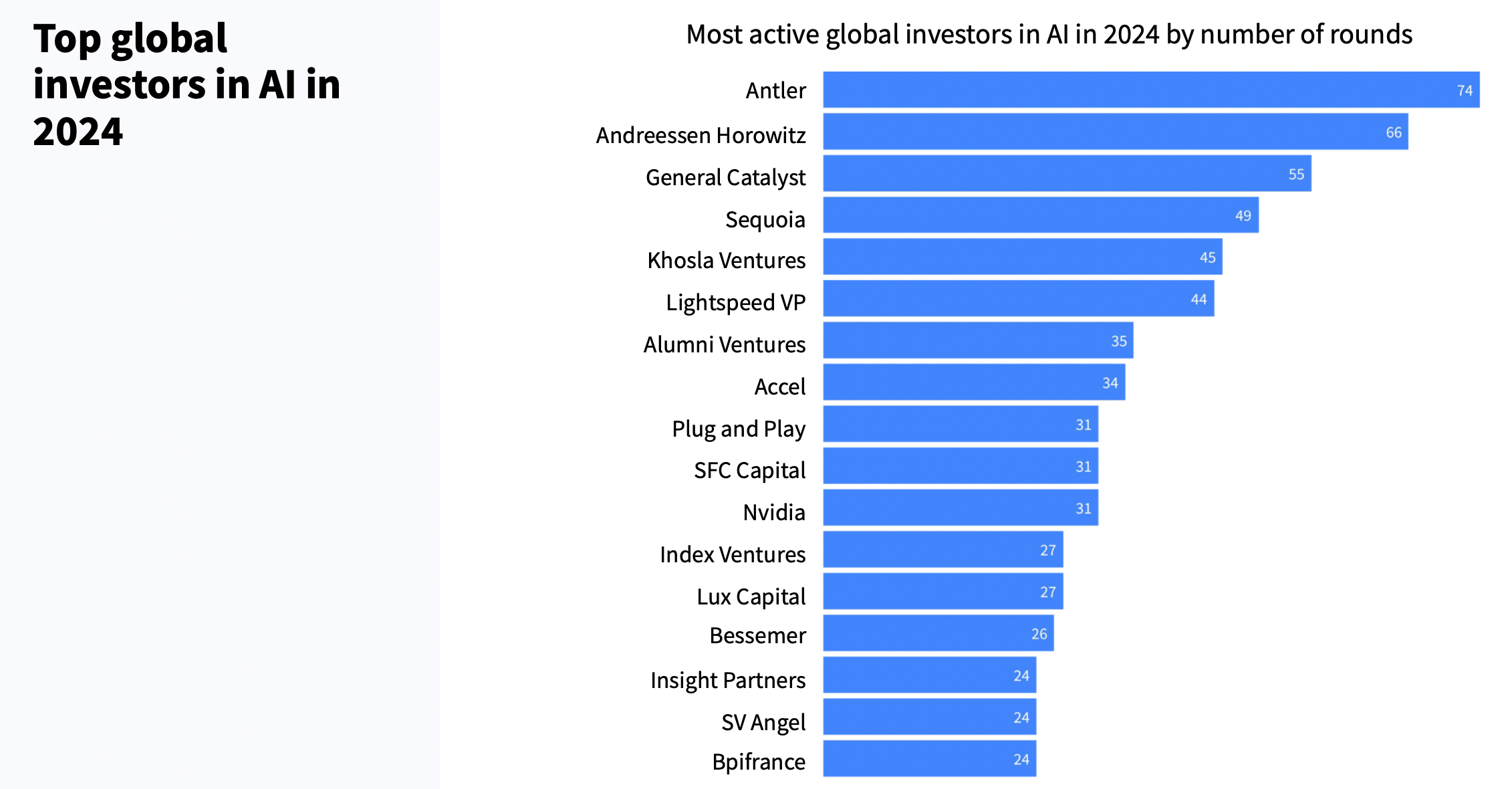 在AI领域内,基础层投资在过去两年对整体增长的推动作用最大。2024年融资规模前九的轮次中,有七轮属于AI公司。