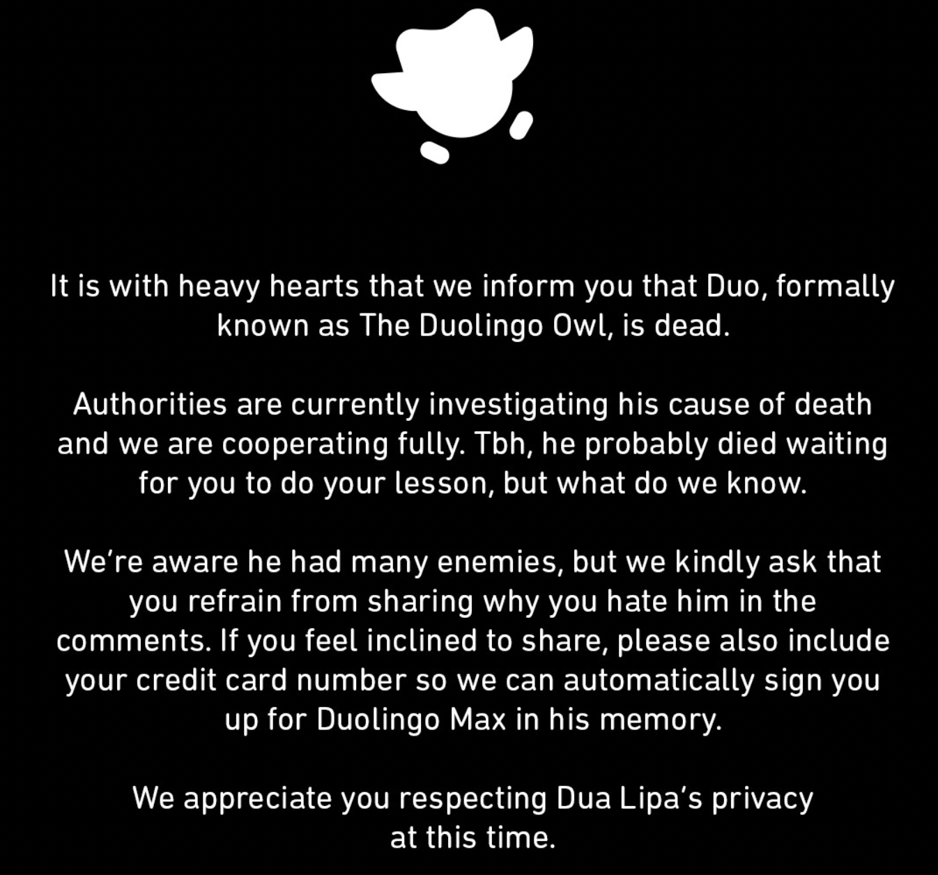多邻国以黑底白字的严肃形式发布声明:“我们怀着沉痛的心情告别多儿(Duo)。” 声明中透露,猫头鹰的死亡原因仍在调查中,还调侃称 “它可能是在等你上线学习时死掉的”。