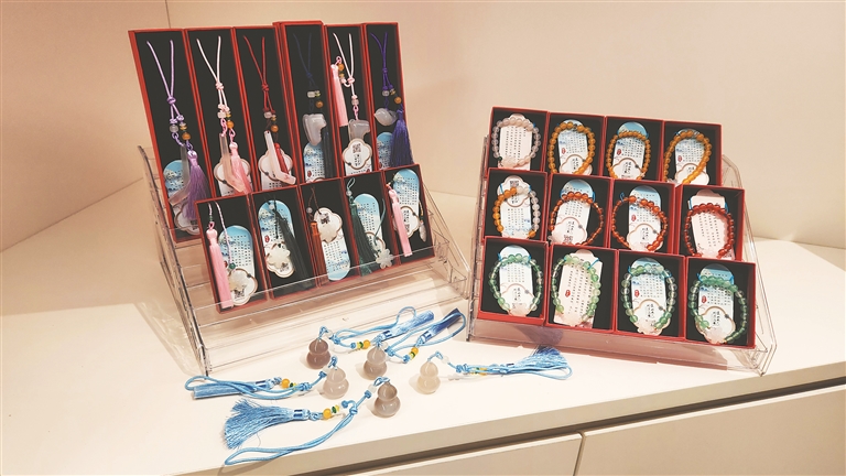 不仅仅是羽绒披肩,卡通造型的羽绒帽、陶瓷冰壶盲盒、AR转好运冰箱贴、流光雪花冰箱贴、玛瑙书签、玛瑙手链等一系列创意设计产品同样在哈尔滨冰雪大世界火爆出圈。