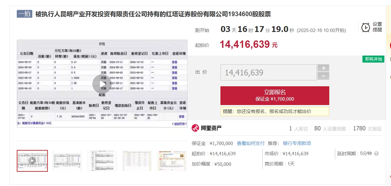 界面新闻记者从阿里司法拍卖网站上观察到,红塔证券第六大股东昆明产业开发投资有限责任公司持有红塔证券约193.46万股将被司法拍卖,初定起拍价为1441.66万元,此次拍卖时间为2月16日10时,截止到12日下午18时,有一人报名。