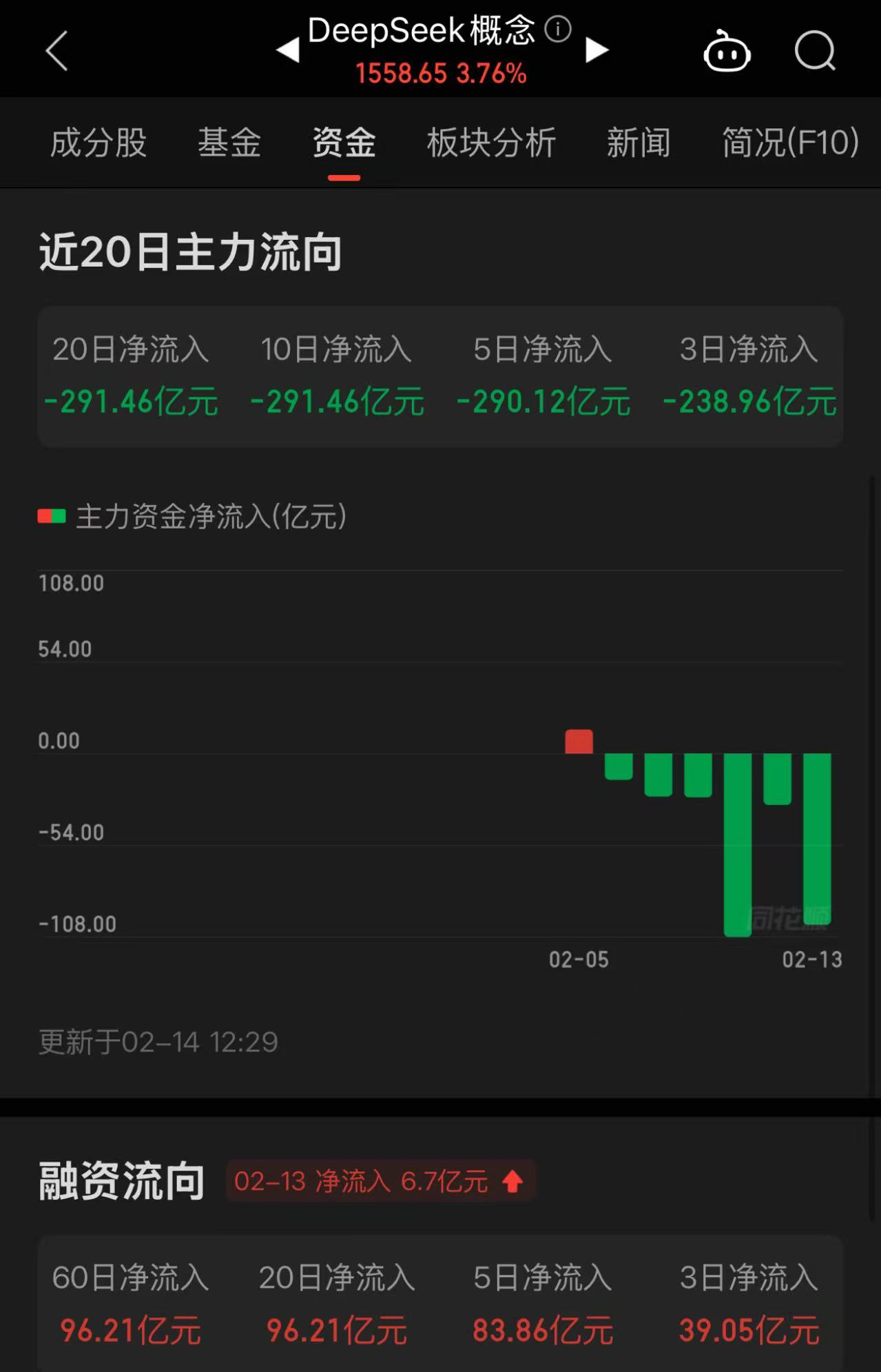 同花顺数据显示,在春节后有数据可查的7个交易日内,DeepSeek概念板块主力资金仅节后开盘首日呈现净流入,随后自2月6日至2月13日连续6日净流出。5个交易日内,DeepSeek概念板块主力资金净流出超290亿元。