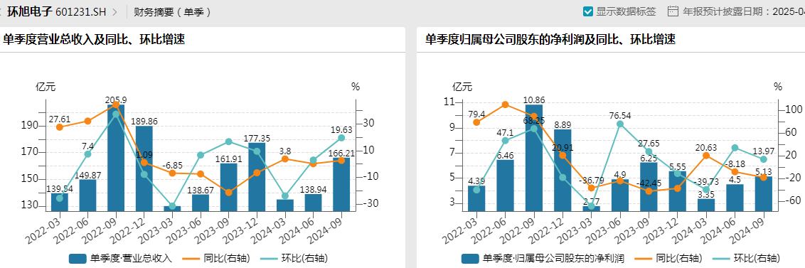 分季度来看,环旭电子的业绩走势仍堪忧。该公司2024年单季度营业收入分别是134.92亿元、138.94亿元、166.21亿元、166.84亿元;归母净利润分别是3.35亿元、4.5亿元、5.13亿元、3.56亿元,第一季度环比下滑39.73%,第二、三季度则同比下滑8.18%、18.03%,第四季度其同比、环比分别跌35.97%、30.63%。