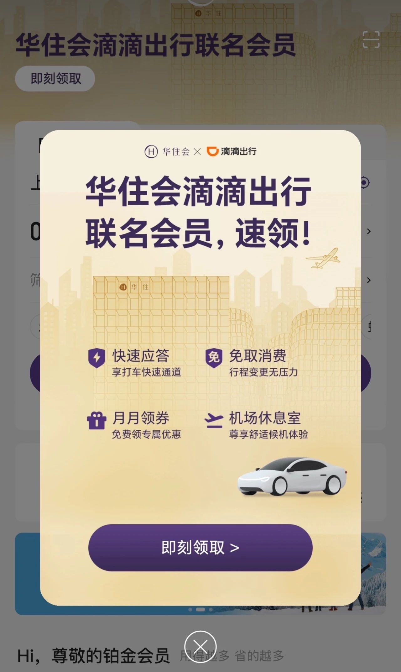 此时,华住酒店集团旗下会员俱乐部——华住会联合滴滴出行推出联名会员,给出了更好的解法:打车快速应答、免费取消、机场休息室、月月领券……每一点权益,都戳到了会员的心巴上。