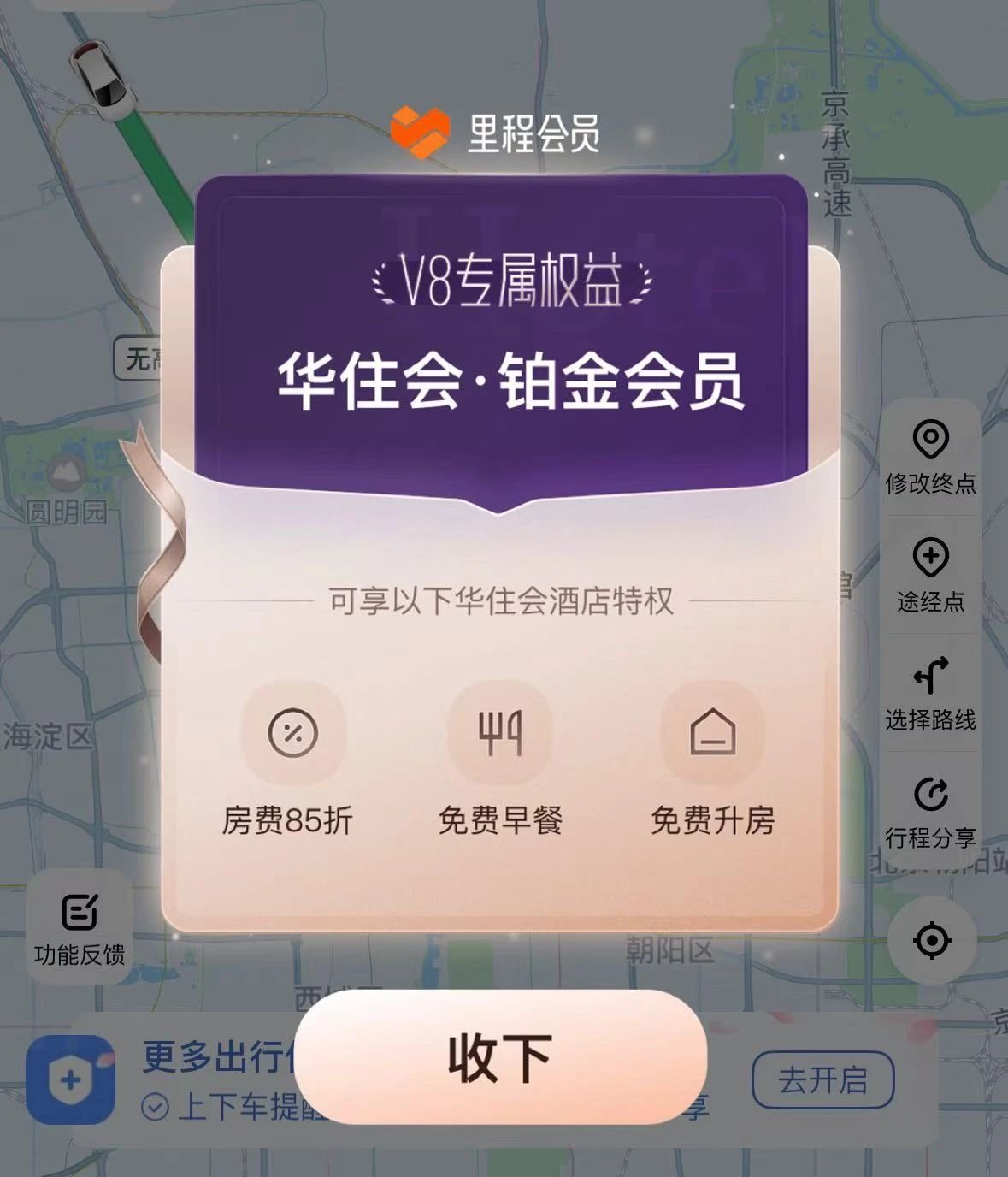 同时,滴滴里程会员可以在滴滴出行App内领取华住会会员。V3、V4会员可领取华住会银会员,V5、V6会员可领取华住会金会员,V7、V8可领取限量华住会铂金会员+限量升房券。联名会员可根据对应权益等级享订酒店房费折扣8.5折起、免费早餐、延迟退房、升级房型等酒店权益。联名会员累积、使用华住会积分还可在华住会商城兑换酒店和生活好物、百度网盘、爱奇艺等各大平台会员。不论生活还是工作、出差或旅行,有这样一个1+1>2的会员身份,都是实打实的超级神器。