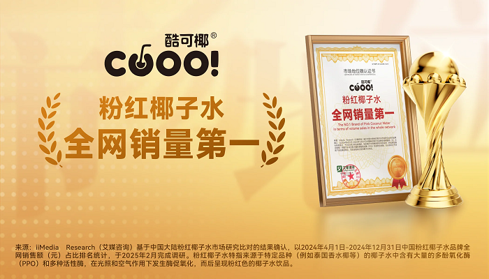 2025年2月,酷可椰获全球新经济产业第三方数据挖掘和分析机构iiMedia Research(艾媒咨询)授予“粉红椰子水全网销量第一”市场地位确认。