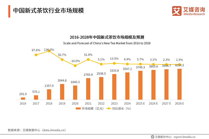 iiMedia Research(艾媒咨询)数据显示,2024年中国新式茶饮市场规模达到3547.2亿元,市场饱和度不断提高,行业内各品牌纷纷进入存量竞争阶段。预计在未来几年,中国新式茶饮市场规模将保持小幅但稳定的增长趋势,到2028年有望突破 4000亿元。
