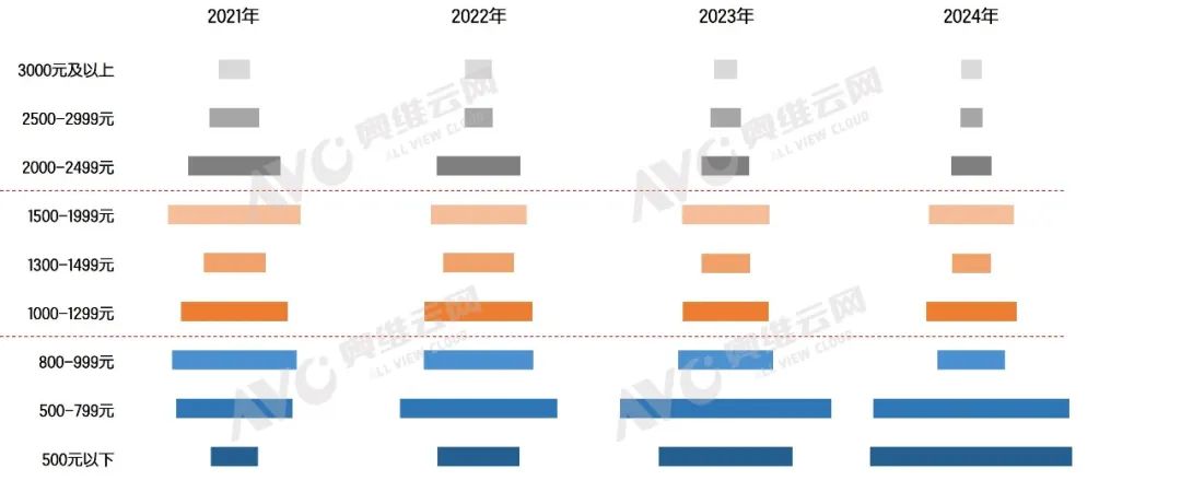零售量的增长表明中国智能门锁市场的需求正逐步释放,消费者的接受度进一步提升。而零售额的下滑则证明在当下激烈的市场角逐中,内卷式竞争已成为企业抢占份额的主要策略,奥维云网(AVC)线上监测数据显示,2021-2024年,传统电商智能门锁的零售均价呈持续下降表现,2024年为1068元,勉强守住千元关口。