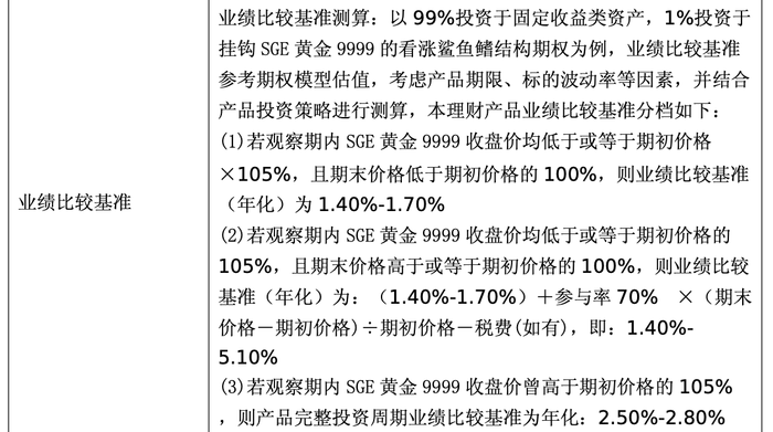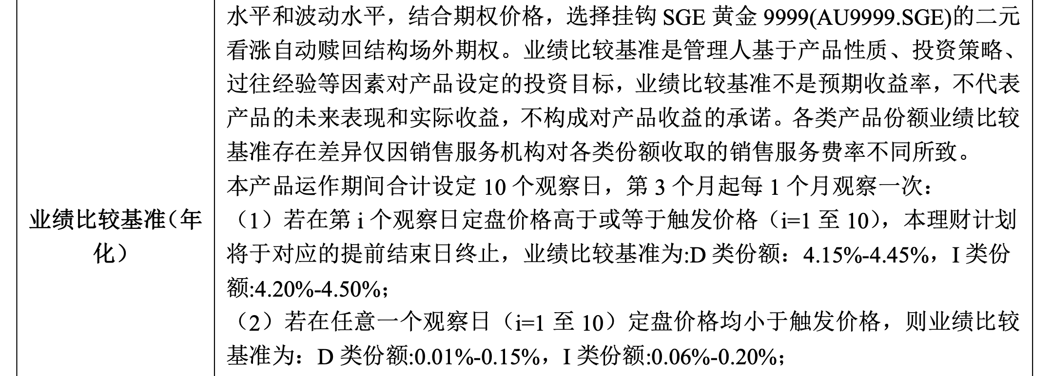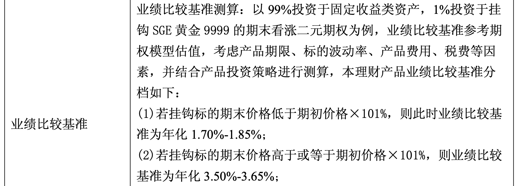 具体来看,挂钩二元看涨类型期权结构的理财产品观察日为产品期末,期末黄金价格只要超过期初价格一定幅度,投资者就能获得高档位收益,业绩比较基准的设定也较为简单,只有高档和低档两档,不存在提前终止的情况。