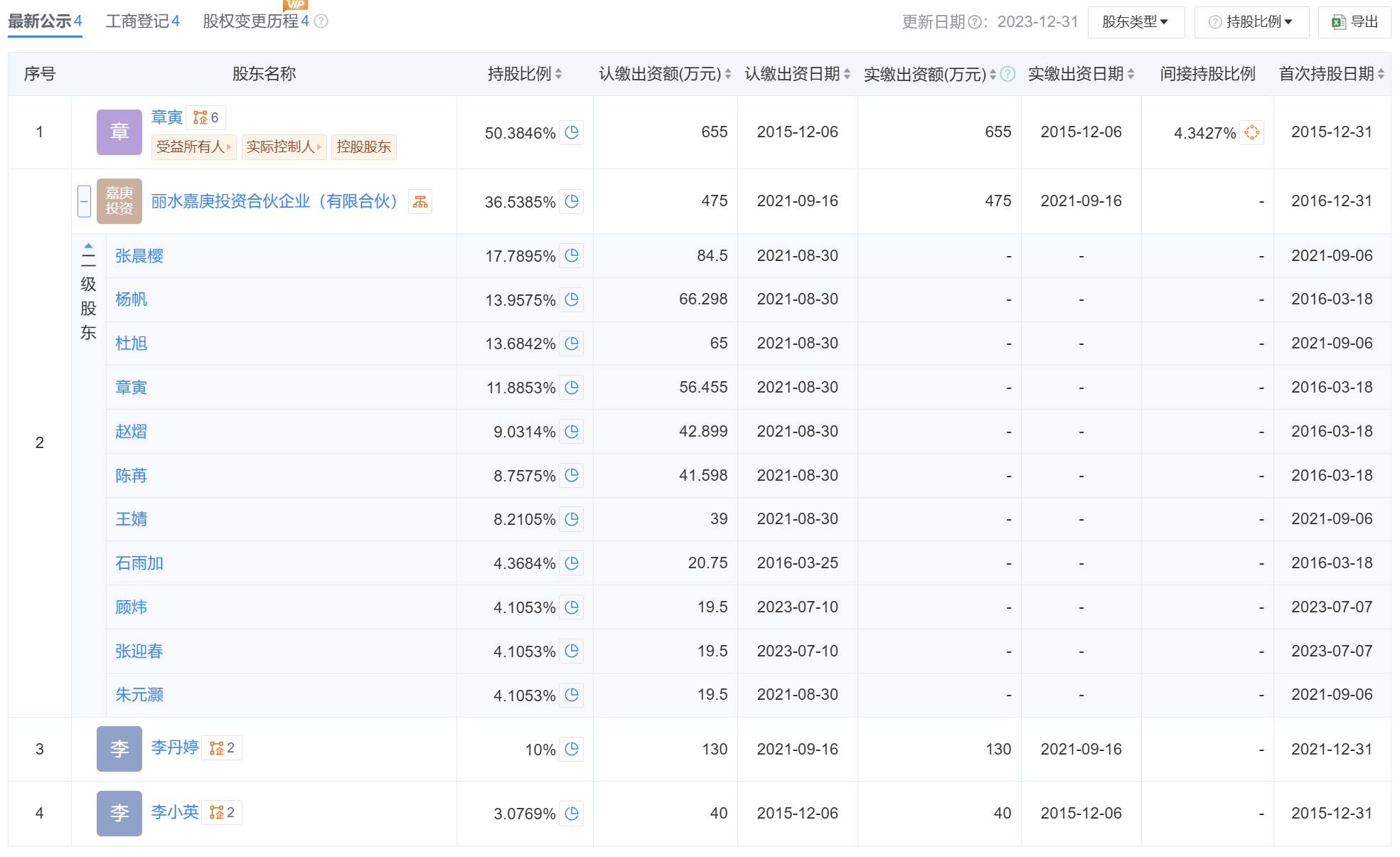 天眼查APP数据显示,截至目前,章寅、李丹婷、李小英三位自然人股东分别直接持有白鹭资管50.38%、10%和3.08%的股权,丽水嘉庚投资合伙企业(有限合伙)(以下简称“嘉庚投资”)持有公司另外36.54%的股权。嘉庚投资目前共有11位自然人股东,其中有4位股东持股比例超过10%,分别为张晨樱、杨帆、杜旭和章寅。