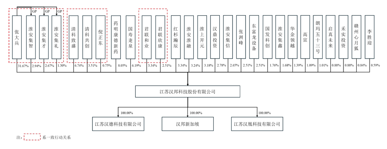 张大兵直接持有汉邦科技31.67%股份,为控股股东。另外,张大兵通过淮安集智、淮安集才和淮安集礼分别控制公司2.94%、2.67%、1.30%股份,合计控制公司38.58%股份,为公司的实际控制人。