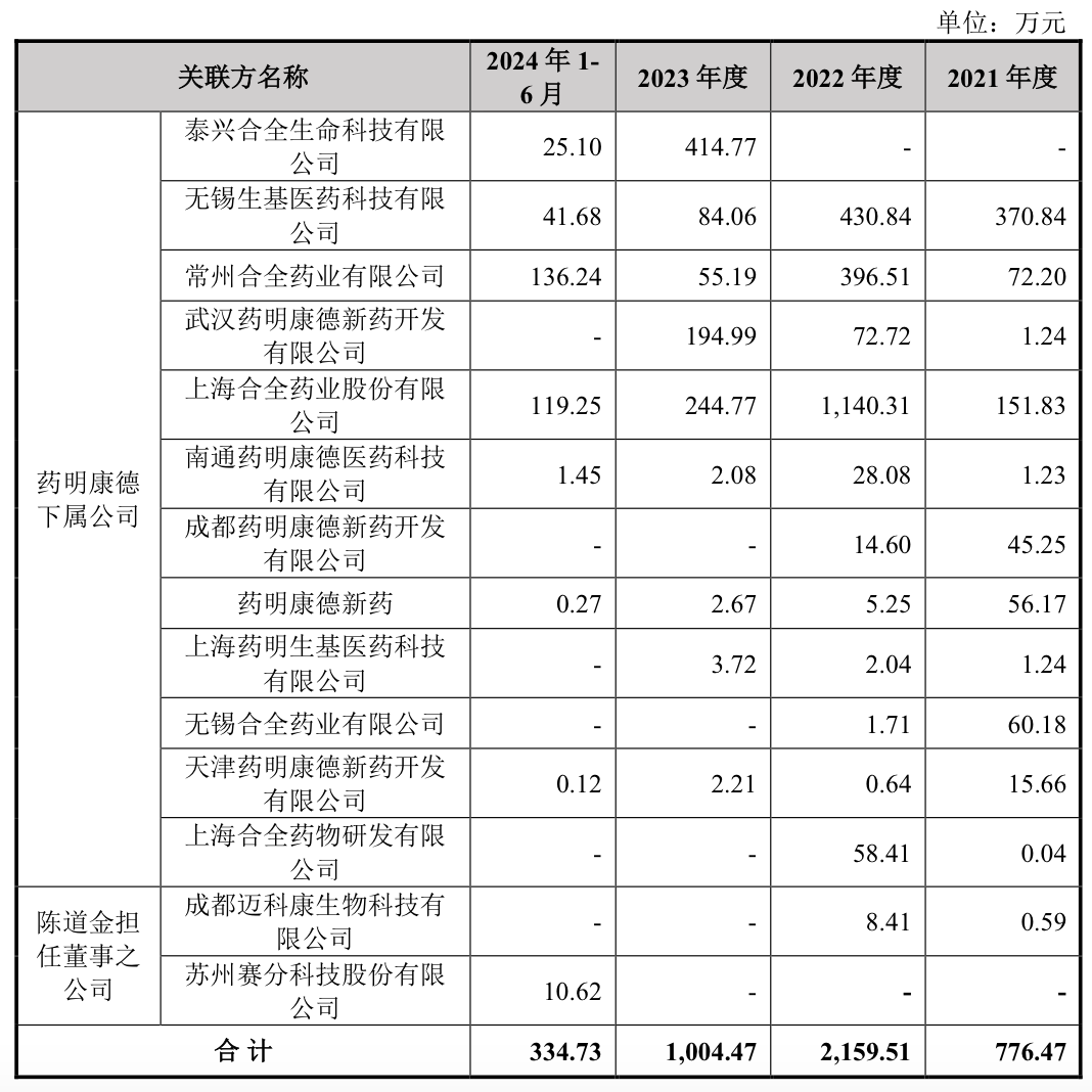 药明康德与汉邦科技亦有关联交易存在。2021年至2024年1-6月,汉邦科技关联交易金额分别为776.47万元、2159.51万元、1004.47万元、334.73万元,其中与药明康德系公司的关联交易金额分别为775.88万元、2151.1万元、1004.47万元、324.11万元,占据绝对大头。