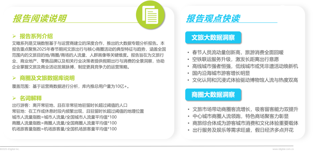艾瞰系列是艾瑞数智基于与运营商建立的深度合作,推出的大数据专题分析报告。本报告重点聚焦2025年春节期间文旅出行与核心商圈活动的典型特征与趋势,涵盖全国范围内的文旅目的地/商圈/商场的人流量、人群画像等关键维度。报告旨在为文旅行业、商业地产、零售品牌以及相关行业决策者提供假期出行与消费的全景洞察,协助企业掌握文旅及商业活动发展脉搏,制定更具竞争力的运营策略。
