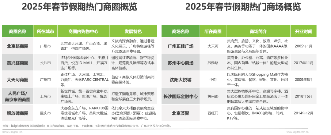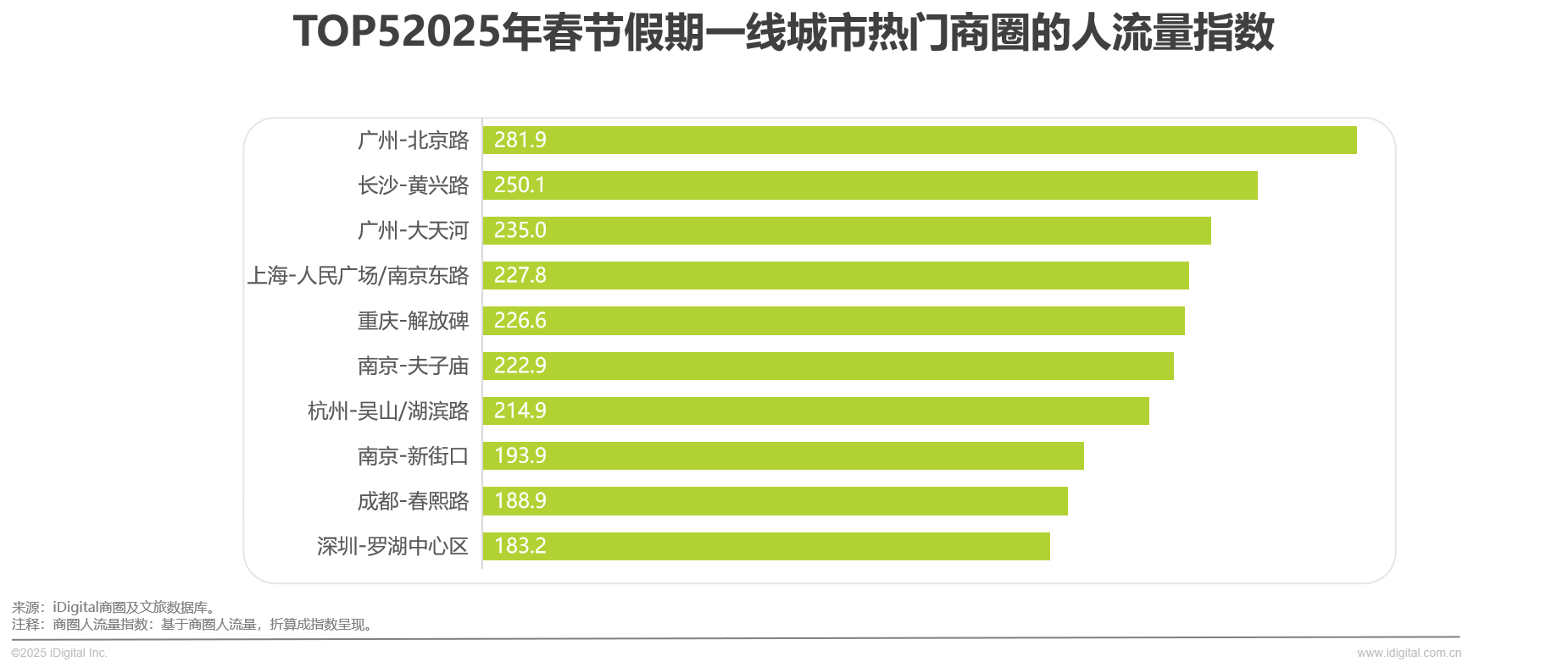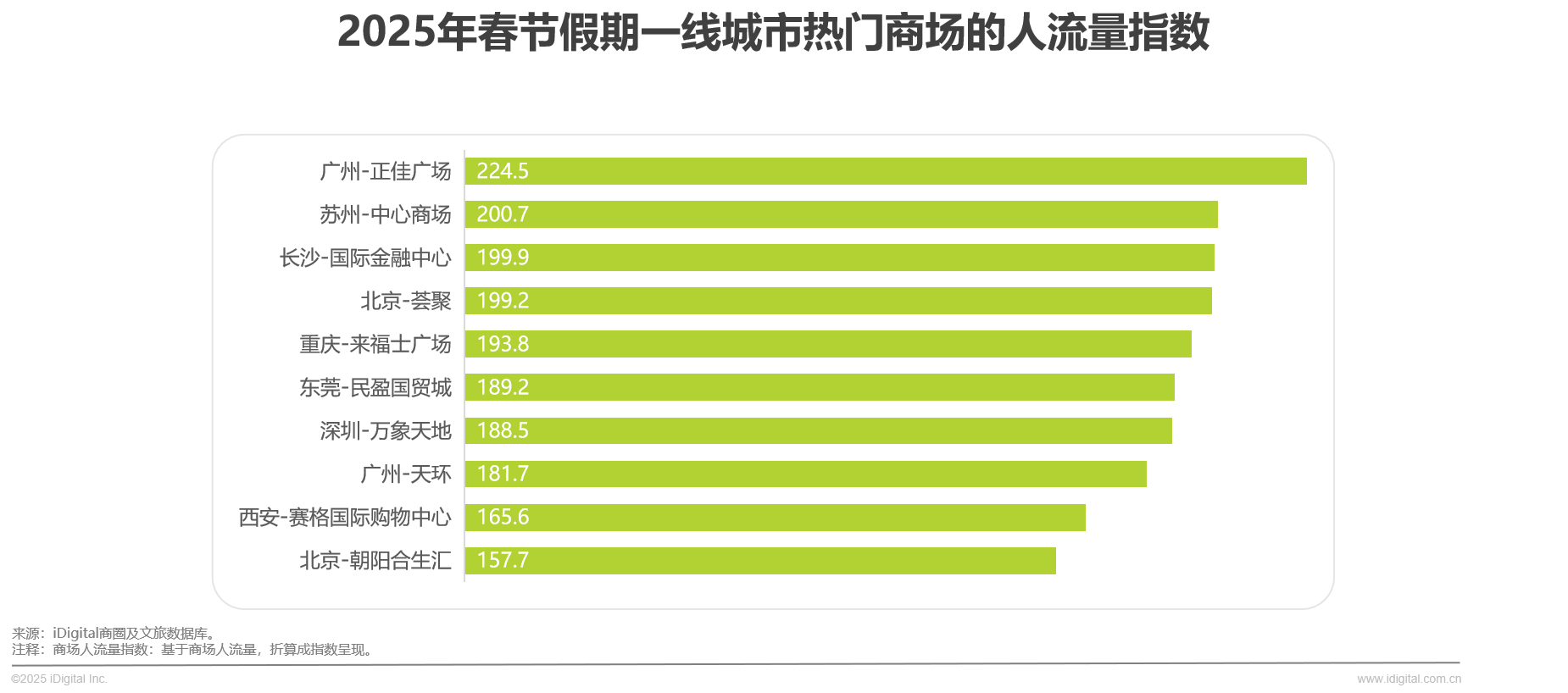 2025年春节假期,部分中心城市的热门商圈凭借地理优势与集聚效应,持续吸引大量人流。如广州的北京路、长沙的黄兴路、上海的人民广场/南京东路等核心商圈,凭借便利的交通和高密度商业环境,人流量居全国前列。同时,特色商场正成为吸引人群的关键增长引擎。如广州正佳广场,通过旅游与零售的深度融合打造沉浸式场景体验,成功吸引游客;苏州中心商场则凭借其“站城一体”的独特设计,实现城市流动人群与商业氛围的联动,成为连接城市内外的交通枢纽与商业地标。