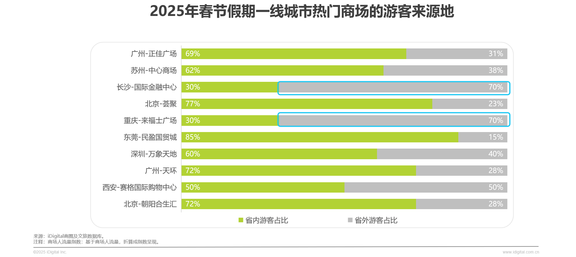 2025年春节假期,一线城市热门商场成为游客“打卡”的旅游景点。例如,长沙国际金融中心与重庆来福士广场通过独特的外观设计,屋顶花园、水晶连廊等景观设置,省外游客占比达到70%,充分发挥商旅联动的辐射作用。商旅综合体已成为春节期间城市消费和文化体验的重要载体,或将进一步引领商场与文旅联动的复合场景趋势。