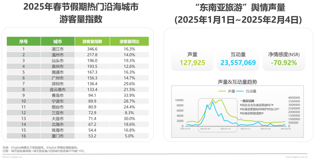 2025年春节假期,国内沿海城市游客同比增长明显。青岛、大连、宁波等地客流同比增长近三成。汕头、北海、三亚、湛江等三四线沿海城市客流同比增长。国内沿海城市得益于更安全的旅行环境及多样化的自然与城市体验需求,吸引力迅速提升。